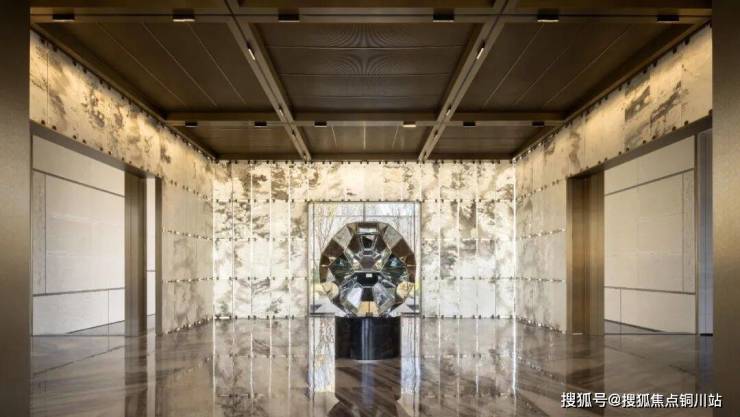 元起观潮的归家大堂,被做成了极具东方意境的“金玉满堂”:定制的“缘起”艺术品、地面的静雅棕奢石、悬垂四周的水墨玉石墙......