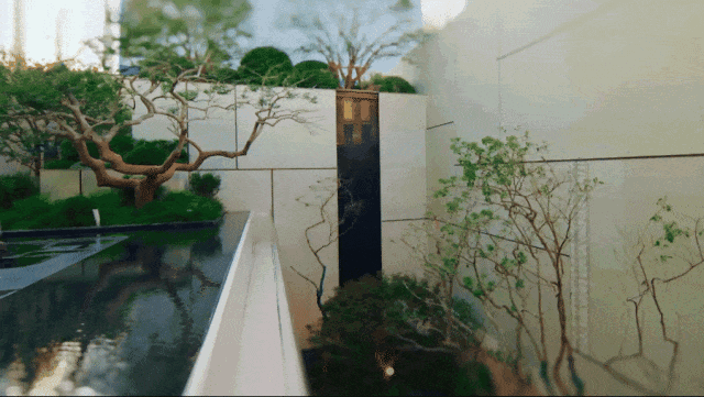 示范区以“立体山水,大隐于市”为理念,将江南园林的造境哲学转化为现代建筑语言。通过多重庭院、路径转折与虚实界面,在有限的地块中实现步移景异、小中见大的沉浸式游观体验。选用沉香米黄砂岩与古铜材质,低调雅奢,历久弥新。