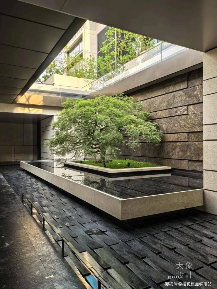 七株精挑细选的红果冬青,生长在层叠的悬浮水院之上。水底的幻彩蓝奢石倒映着天光云影,将杭州的立体山水浓缩进整片园林之中。