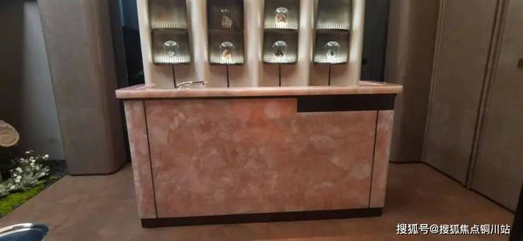 逐光星庭水吧台同频海鸥丽晶的艺术审美,整体水吧台造型以及艺术灯具的设计灵感来源于精致的水晶首饰盒,绿水晶奢石吧台,流光溢彩。