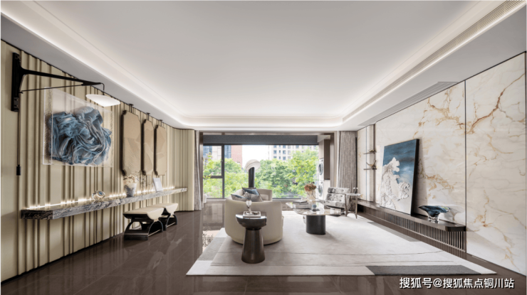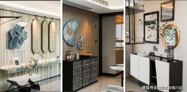 再比如将传承园林的山水、窗棂特色灵魂,融入室内设计中,客厅、卧室随处可见3D立体浮雕肌理画,水墨风韵的岩板用作电视背景墙,再搭配温润弧形吊顶……整个空间,成为盛满生活美感的容器。