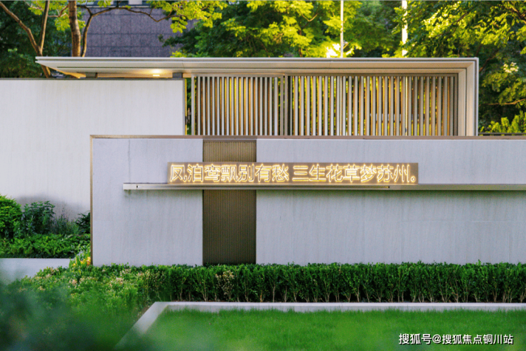 示范区大门承袭了古建筑的传统,注入了现代元素,金属格栅+石材材质,搭配地被植物,展现出独特的风貌,有一种大隐隐于市的感觉!