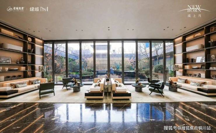 香槟金铝板吊顶搭配范思哲黑、普拉达绿等奢石,将现代建筑的“奢”与东方意蕴的“雅”融合进归家之门。