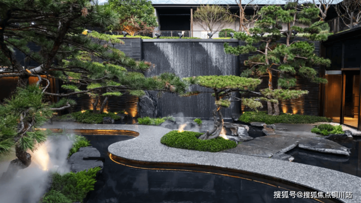 国际隐奢美学示范区,以“万壑松风”为灵感,提炼松林、飞瀑、石径、云雾、流泉五大场景,约6米高黑金沙花岗岩叠景墙、5棵泰山全冠移植黑油松,营造“虽由人作,宛自天开”的东方意境。
