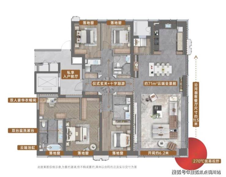 近50㎡豪华主卧套房,开间约7.2米,巨幅落地窗俯揽央景。抬头清晨的第一缕阳光、夜晚的璀璨星空,都能居家拥揽。