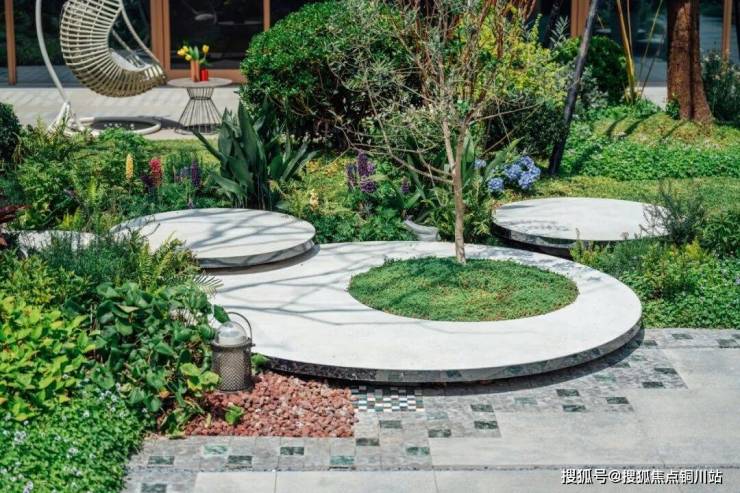 水磨石台面构建的花园小径,与整个绿地景观相生相融,圆润的线条与景观的此起彼伏相得益彰。