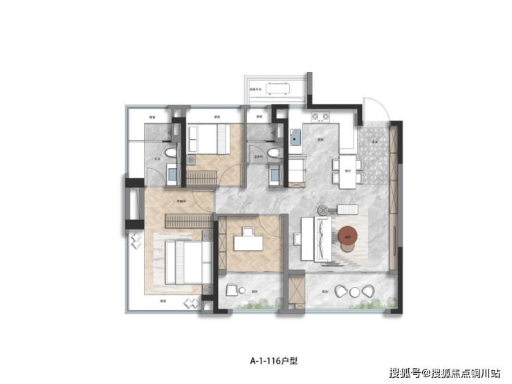 建面约116㎡3房2卫动静分离的户型,几乎是这个市场上最好的户型。