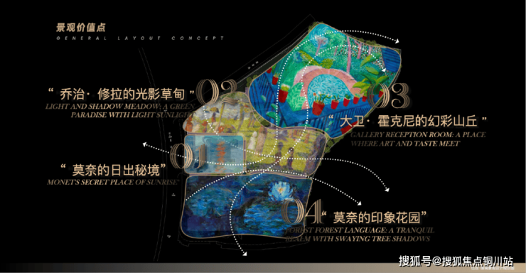 景观设计上,项目构建了“一轴四园十一境”的沉浸式体系,将世界大师名画复刻,从莫奈的日出秘境、乔治·修拉的光影草甸,到大卫·霍克尼的幻彩山丘、莫奈的印象花园,让每一次归家都成为穿越森活秘境的微度假之旅。