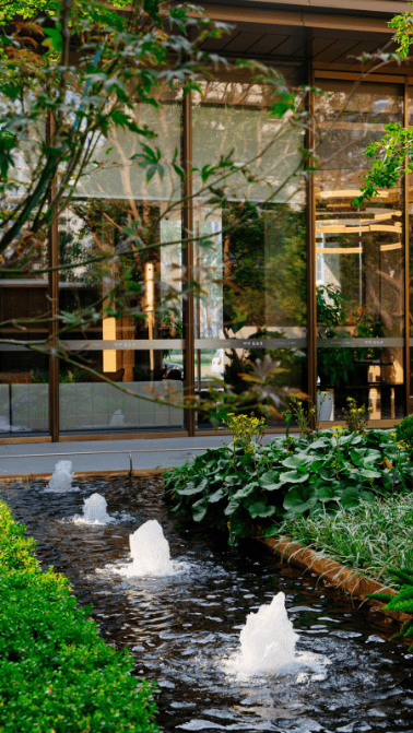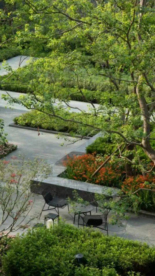 步入社区,一眼便能看到层层叠瀑,融入绿韵醒目的景观笔触里,叠水、草坪、庭院、建筑与林下空间等元素组合到一起,层次分明,情景交融。