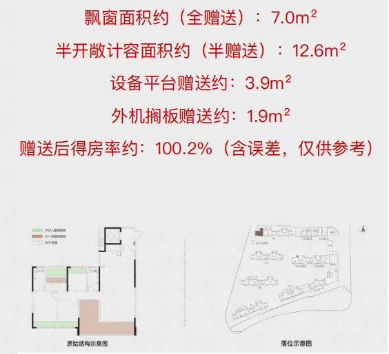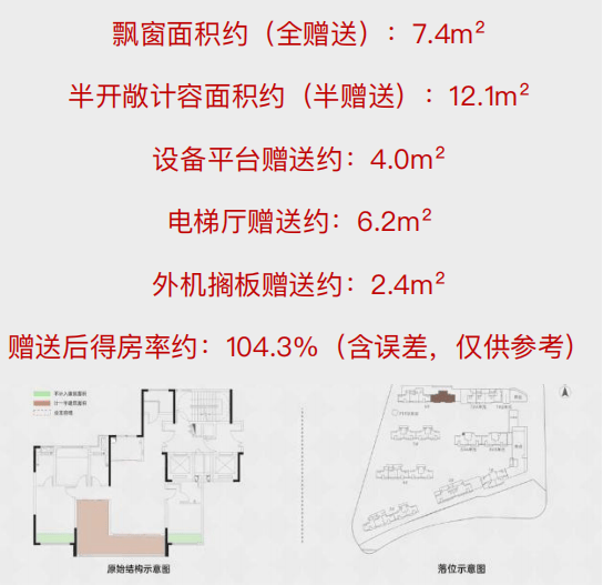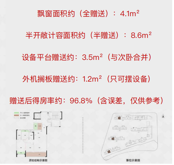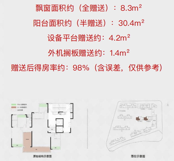4房2卫格局,客厅面宽4.5米,阳台面宽7.3米,客厅可与南向次卧打通;形成超长的南向采光面。全赠送的全屋飘窗+ 半赠送的生活阳台和设备平台,实用面积约117m²,初步算得房率约96.8%。