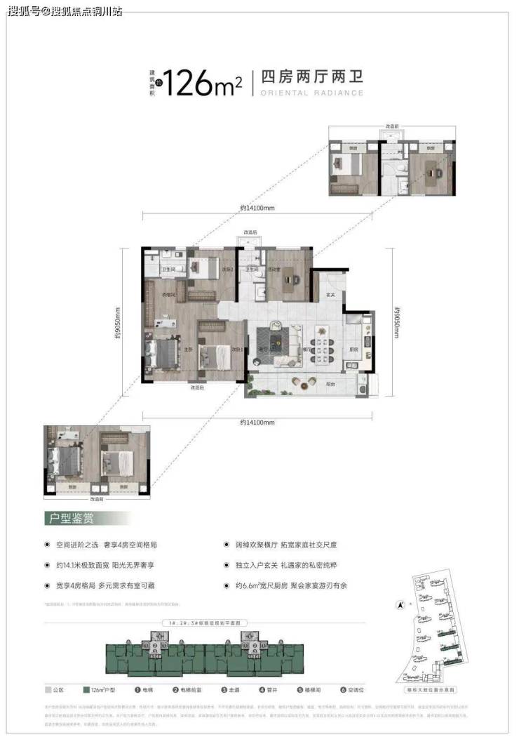 建面约126㎡户型,则以四室两厅两卫,利用户型的方正感,去追寻居住最大的“舒朗感”。