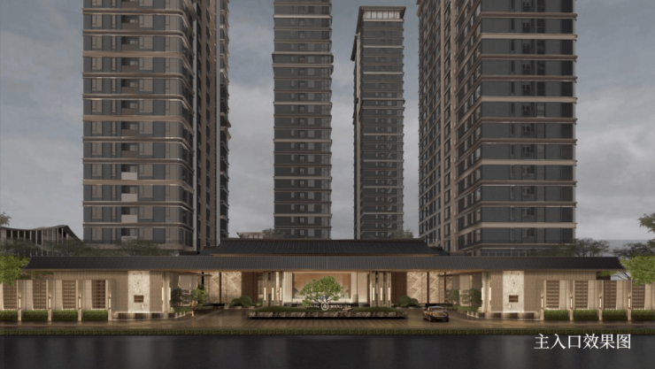 入口会所售楼处略微起翘的双坡屋顶,横向展开,均衡平直,类比于新中式建筑檐口的舒展感;转角独立小楼屋顶的金属挑檐模拟了层叠的古建檐口所形成的自然、简约的起伏;商业和楼栋基座有高度且有厚度的檐口线脚则是廊檐的抽象表达。配合石材、玻璃等现代材料的使用,克制凝练的设计手法,达到在当代转译新中式之美的设计理念。