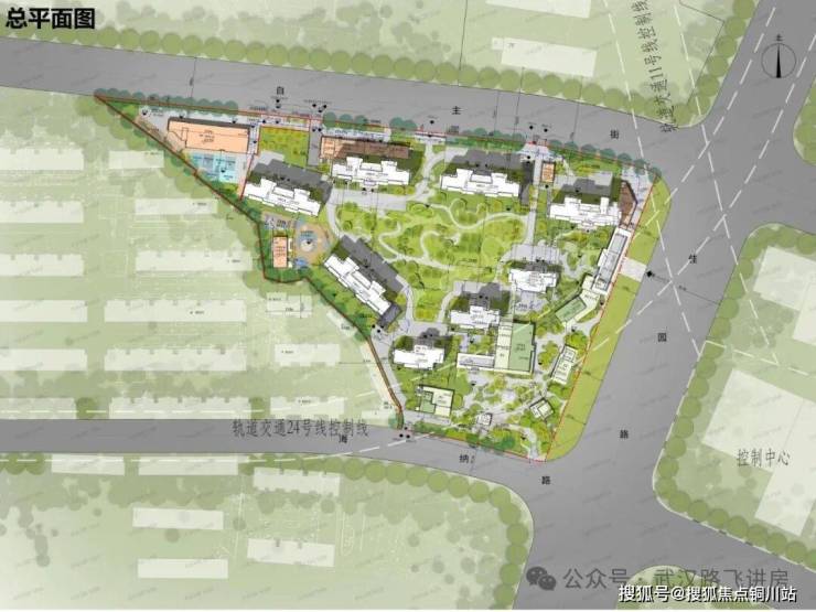 从平面图来,B地块形状不规则。北侧、东侧、南侧均为道路,西侧为现状住宅。8栋住宅呈现围合式布局,形成了比较集中的园林空间。7、9号楼为南偏西朝向,其它楼栋基本为南北朝向。33层的2、3、7、8、9号楼可见连廊结构。