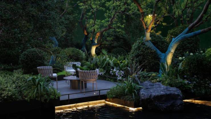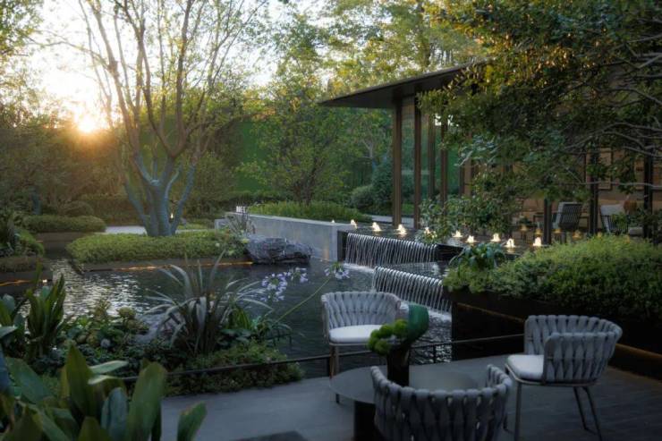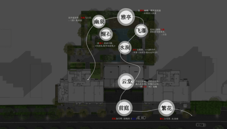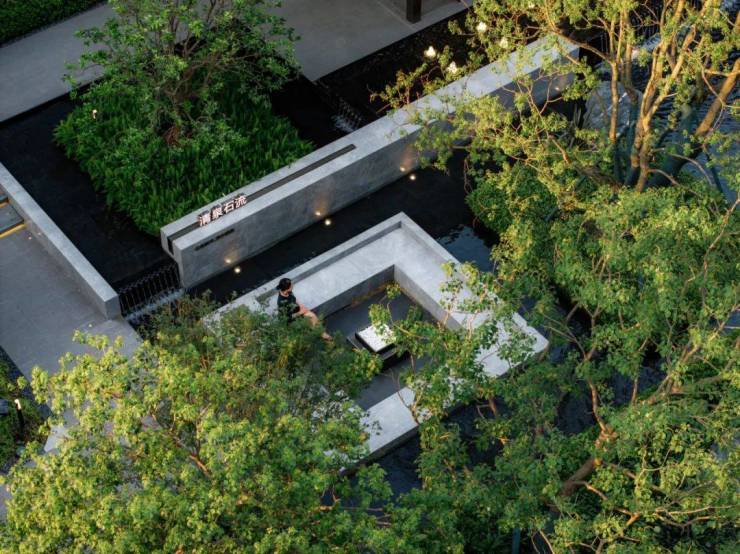 设计充分利用场地周边积极因素,溯源无锡寄畅园。巧于因借,步移景异,置石理水、曲径通幽,融入“门庭、飞瀑、水涧、雅亭、繁花、静林、醒石、清泉”古典造园元素,结合现代人审美营造东方隐奢的气质,大雅至简的空间,洄游于半山半水之间,每走一步是不同风景,每看一眼都有不同的心境。
