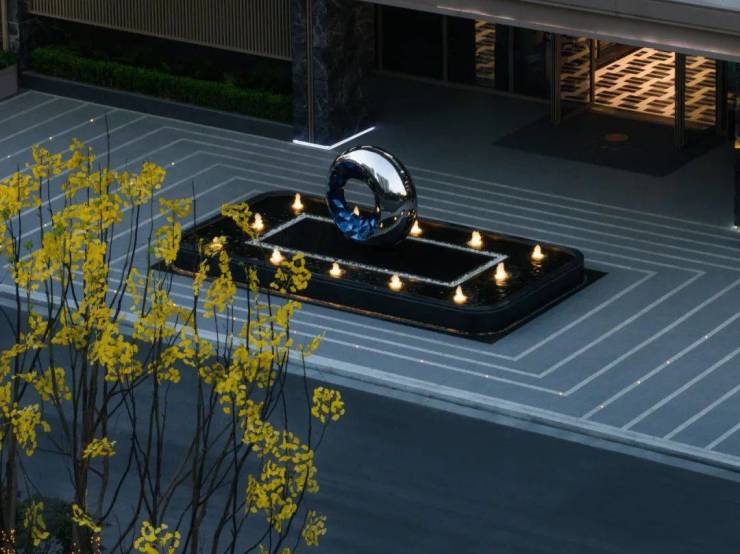 进入内庭空间,山涧流水跌瀑给予后场空间趣味与惬意。我们利用有限的场地,营造不同的高差变化,高耸的飞瀑流水,层层的清泉叠水,清脆悦耳。水景花池采用古铜色不锈钢边带,池底采用黑金沙黑花岗岩,且做了不同于前场水景的整黑系处理,整体形成几何肌理的视觉延伸。