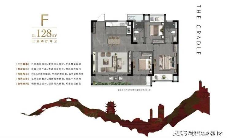 建面约128㎡户型是项目的主力户型,设计为3房2厅2卫,四开间朝南,南向约8.7米大阳台。户型方正,布局合理,得房率超76%(不含赠送),整体空间尺度和配置在无锡市场上极为稀缺。