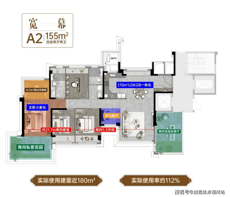①超大面宽:建面约155m²南向双露台户型的面宽直接做到约21.7米(轴线尺寸);建面约183m²南向双露台户型更是达到了惊人的约24.7米(轴线尺寸),成为目前经开区200㎡以下户型中面宽最大的户型。