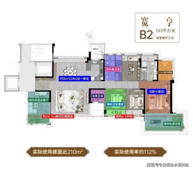 建面约183㎡户型实际使用面积在建筑面积约206-214㎡之间,实际使用率达到了约112-116%。