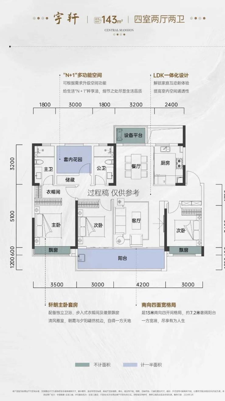 建面约143㎡户型四开间朝南,全明通透。