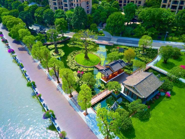 园林景观堪称无锡星河湾的一大亮点。项目承袭香山帮造园技法,将国粹榫卯工艺融入其中,筑以六角凉亭和茶轩,打造中式经典园林。在园林中,能看到大量运用榫卯工艺构建的亭廊轩,其精致程度令人赞叹。
