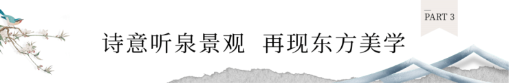悉心秉承东方园林意境,依循“山水境,诗意居”的景观造法,将第二重景观“听泉”融入示范区。 此景 由林荫廊架搭建而成,廊架采用的是铝板造型工艺,其内侧采用的则是不锈钢造型网格垂帘、水幕景墙工艺 。两侧采用是玻璃景墙、造型石材干挂景墙。玻璃材质为山水增添一层朦胧轻盈的质感,植物倒映在水中,透过玻璃,隐约可见叠石驳岸,树木掩蔽,静中有动,浮翠苔草野趣生机,山石流水姿态万千,环园以观,天地间尽显乾坤。