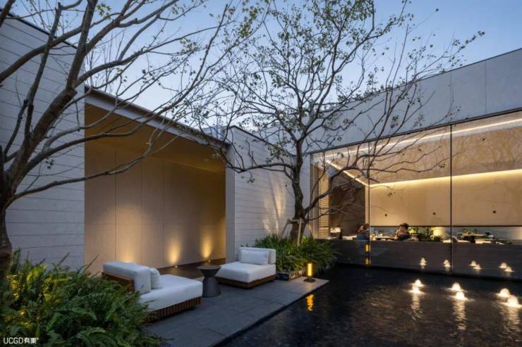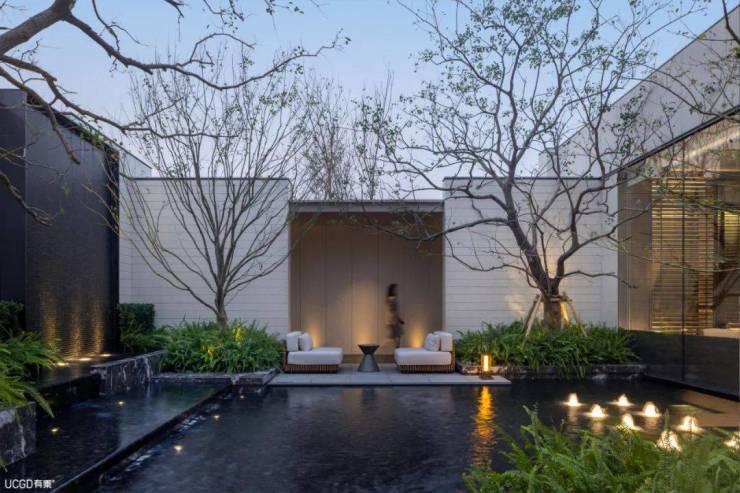 穿过接待前厅进入静心庭院。墙面围合,形成安静隔绝却又开放的私密空间。第二个庭院以动中有静、移步换景的苏式游园场景来布置空间格局。庭院、叠水、奢石、坐凳共同组合而成一个纯粹又自然的度假感现代庭园。