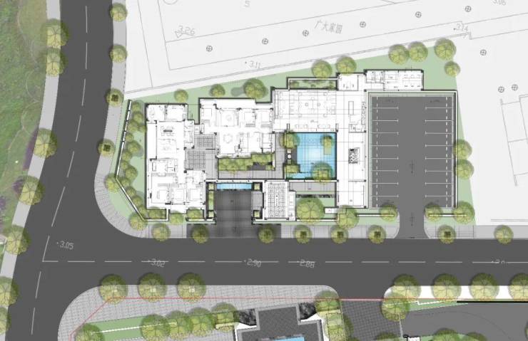 入口前庭是度假式生活的起点。璞拾胥江入口处的转角景墙仿佛一卷画卷,把嘈杂与喧嚣隔绝在外,营造出了尊享街区的领域氛围。第一个入口庭院引入了天光,将四方前庭打造成奢华又隐秘的酒店式入口。