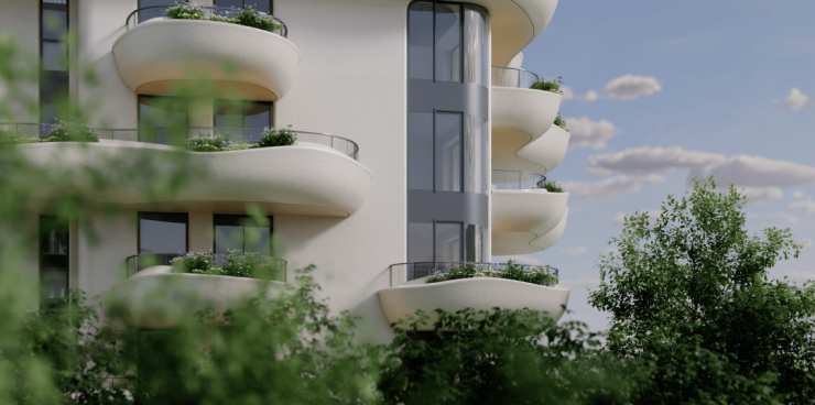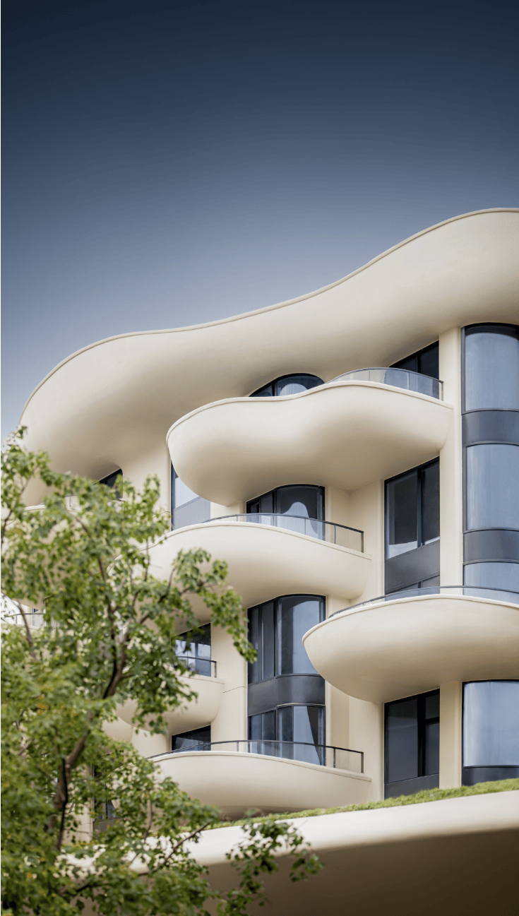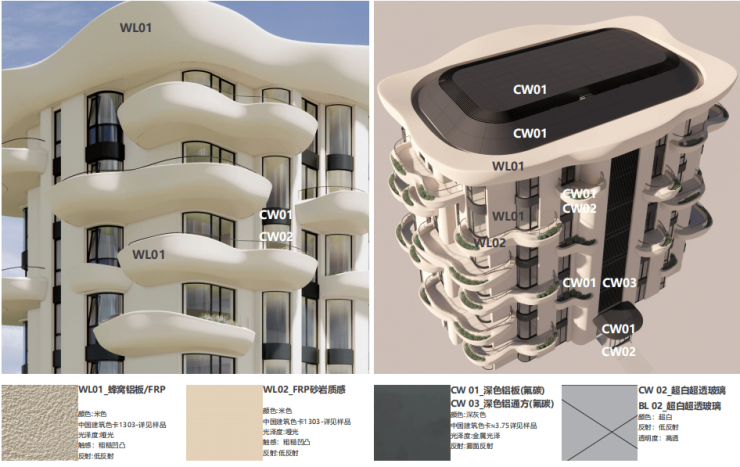 松苑外立面采用GFRP玻璃纤维增强树脂材质,此种材质性能优异,具有高强度、轻质、高模量、易于塑形、耐腐蚀等优点,多用于汽车行业、电子电器领域、船舶制造、体育器材领域等方面,这几乎是在住宅项目里的首次应用,总体原则就是实现建筑幕墙的美观性与轻量化结构,保证主体安全与居住舒适度。