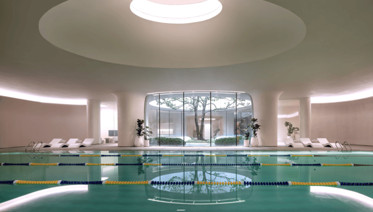 会所的空间模块比较丰富,一层是展厅空间,二层是儿童游乐区,以及公共集会场所,负一层有健身房、恒温泳池,还有惊艳的穹顶造型的会所美食餐厅。