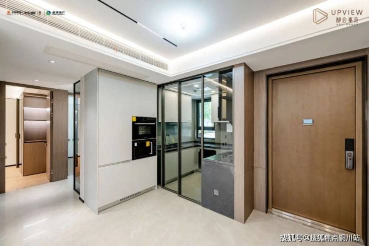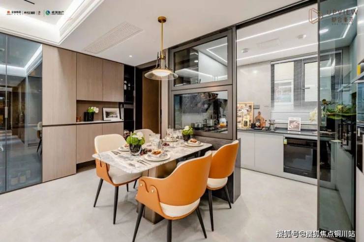 都会峯范的创新设计,更多基于人性化需求。110㎡户型,厨房与餐厅的实体墙,改成了可上下推拉的玻璃窗,可做观察窗,也可无缝传菜。厨房还是台面无烟道设计。