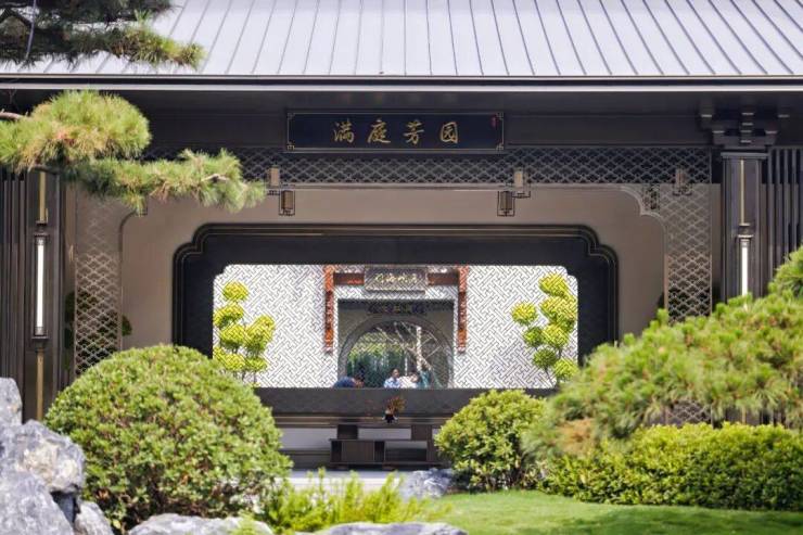 汲取留园五峰仙馆灵感三进院「满庭芳苑」,浮岛叠翠立体景观,甄选造型别致的黑山石,将江南名苑的秀气浓缩于庭院中。
