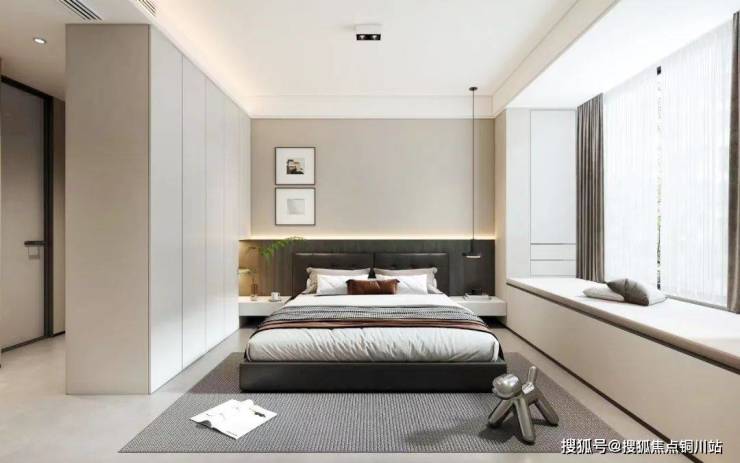 卧室以低饱和色系构建宁静基底,浅灰墙与米白柜弱化边界,营造舒展氛围。悬浮床头借线性灯带勾勒轮廓,虚实间拓展视觉层次。窗边飘窗融入收纳,绿植与艺术画点缀,让休憩空间兼具实用与诗意。