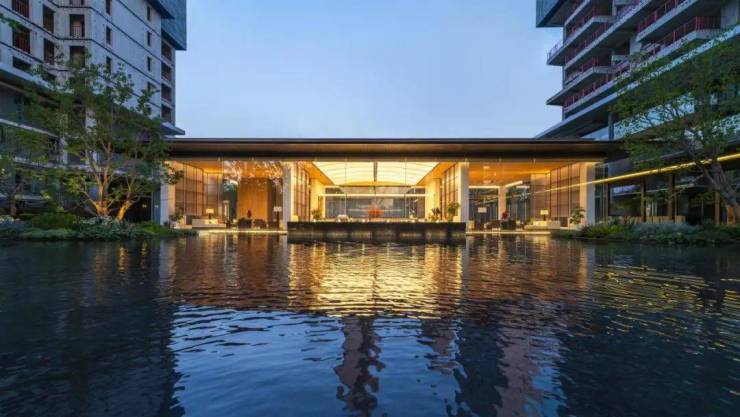 社区大堂东侧是晶莹透光的沐光亭,内设空调,从里向外看流水潺潺别有一番景致。
