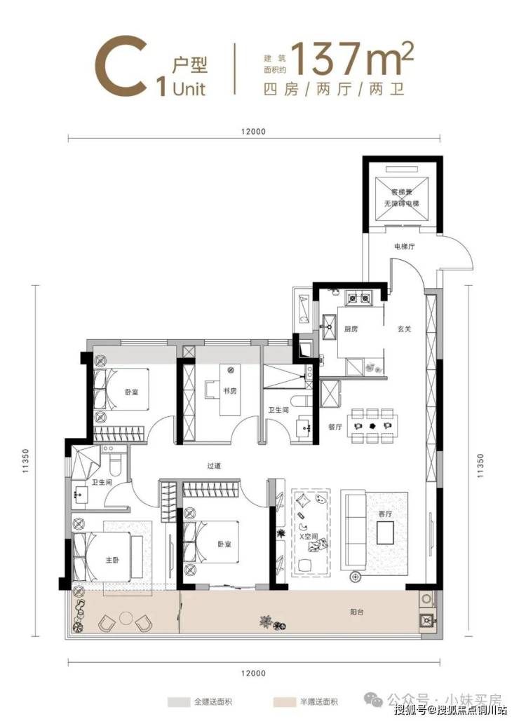 C1户型(建面约137㎡,四房两厅两卫):