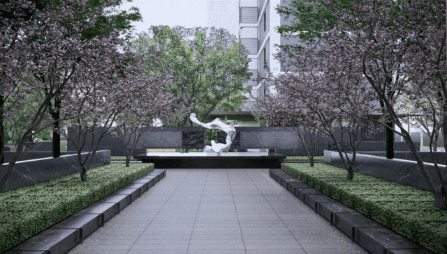 把安缦酒店的设计理念注入整体园林景观布局中,用一环两轴串联全龄社交生活情景,以仪式感的场景打造隐于都市的庭院艺术生活。