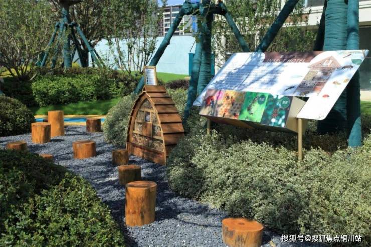 生境花园设有植物和昆虫科普板、昆虫旅馆、鸟类树屋等互动装置、木桩及游戏架等科普游乐小品设施,营造特定生物的觅食生境,寓教于乐。