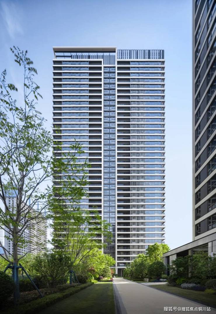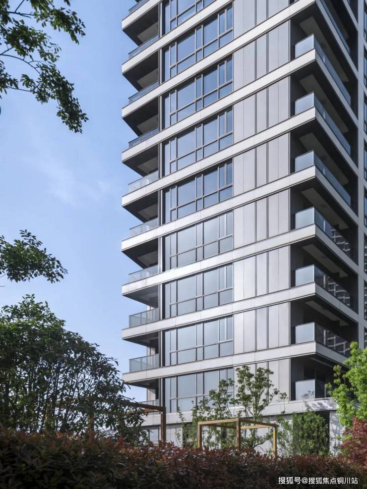立面用大玻璃面,形成与长江水天一色的滨江风貌,而米白色与暖灰色铝板的使用,让整体形象形成柔和且有温度的居住质感。