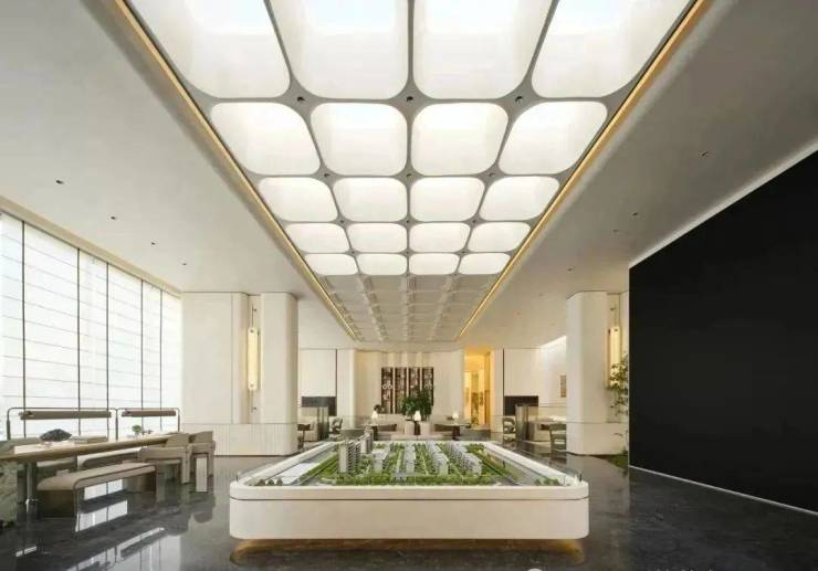 顶部则采用约5米的净空挑檐,搭配复古风格的做旧铝板吊顶,营造出一种庄重而热烈的入口仪式感,为归家之路增添了一份尊崇与礼遇。
