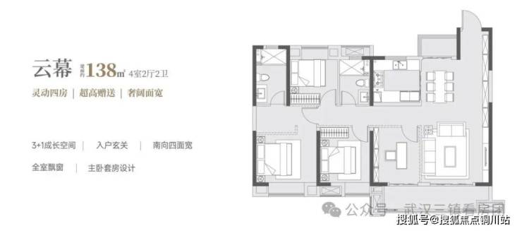 约138㎡【4房2厅2卫】四开间朝南,南北双阳台设计,IMAX景观视野