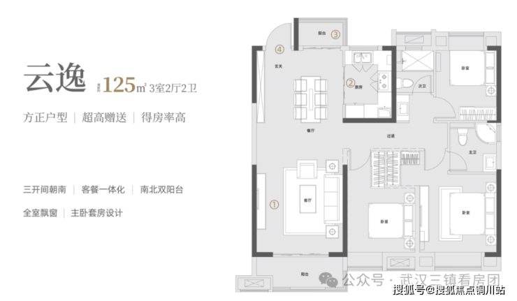 约125㎡【3房2厅2卫】南北双阳台,大尺度三房,超高赠送,高得房率