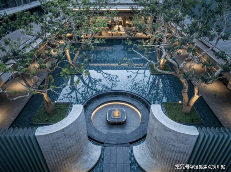 合院采用“超流体”风格的立面线条,搭配金色美学设计以及独特的“木纹转印铝格栅”,让建筑呈现轻盈灵动的未来感。