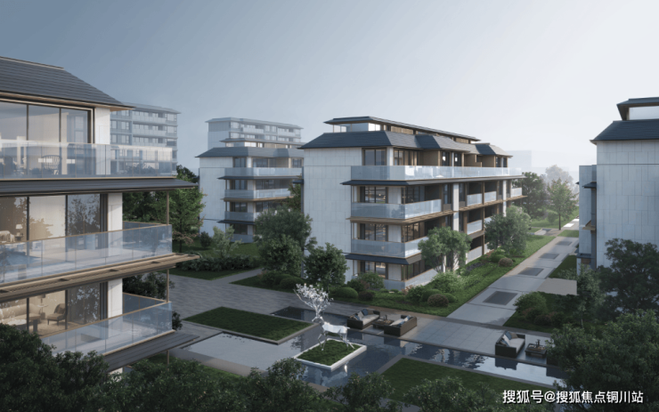整个立面,铝板+仿瓷石板,辅以一体板,隔栅的新中式仿宋风格建筑视角,令人眼前一亮。