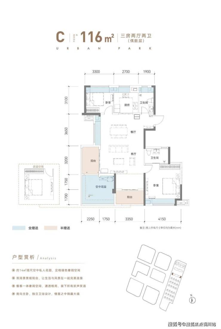 ② 偶数层约13.8平空中花园+双阳台+5个飘窗,几乎无面积浪费,室内空间更充裕。