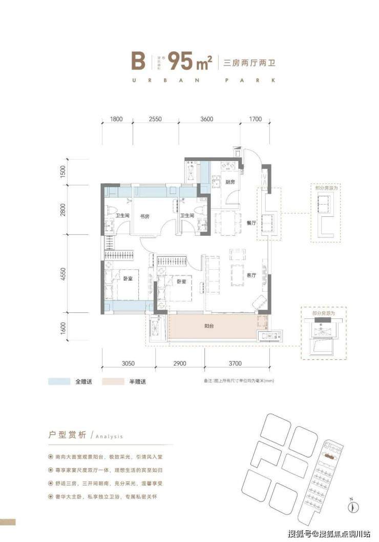 B户型建面约95平,三房两厅两卫(G地块门槛级产品,总价约50多万住“越级三房”)