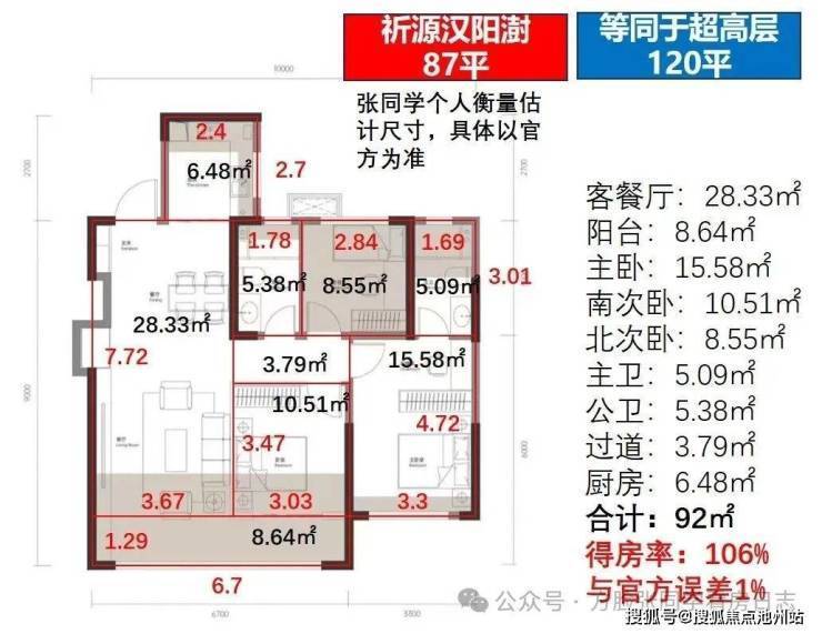 首先是87平户型,标准三房两卫,中间户,我预估的套内92平、得房率106%,与官方宣传105%基本一致。套内面积等同于之前超高层120平。