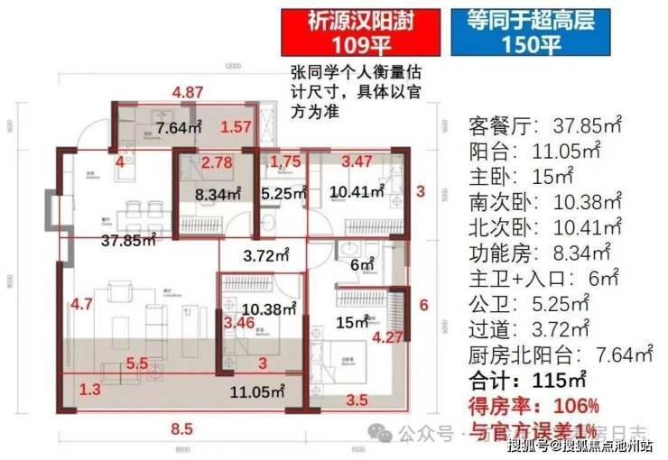 再是109平户型,4.5房边户,我预估的套内115平,得房率106%,与官方宣传105%基本一致。套内面积等同于之前超高层150平。