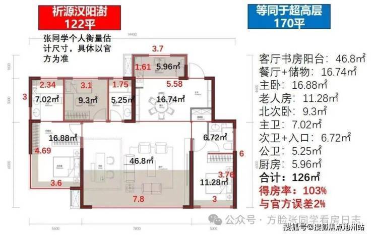 最后是122平户型,四房三卫边户,我预估的套内126平,得房率103%,唯一比官方宣传还低的,有点奇怪,考虑这个户型的最好等到样板间或实体楼出来再说。套内面积等同于之前超高层170平。