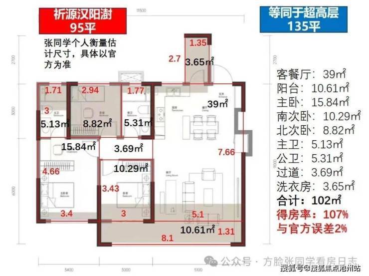 然后是95平户型,3.5房中间户,我预估的套内102平,得房率107%,略高于官方宣传,误差算合理范围内。套内面积等同于之前超高层135平。