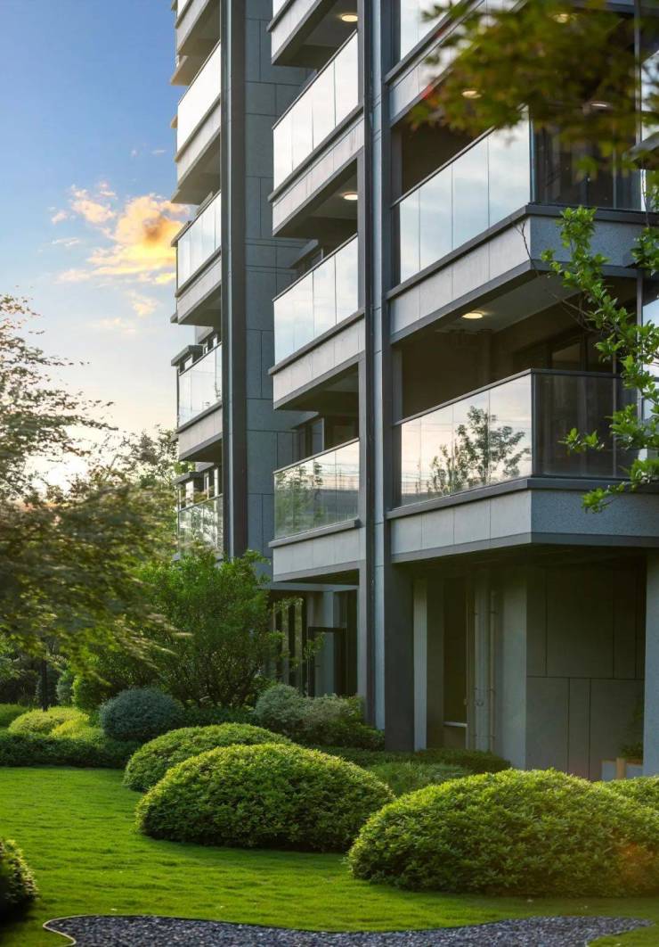 宽约 30 米的入户大门尽显恢弘,以高尚酒店式标准精心打造,外部墙面采用干挂石材,搭配铝板格栅与铝合金线条,在阳光的轻抚下熠熠生辉。大门两侧,两棵数十年树龄的迎客松傲然挺立,它们采用全冠移植技术运输、栽种并悉心养护,多次调试的栽种角度,让其雄浑苍劲的姿态得以完美呈现,如同忠诚的卫士,恭迎着业主回家。