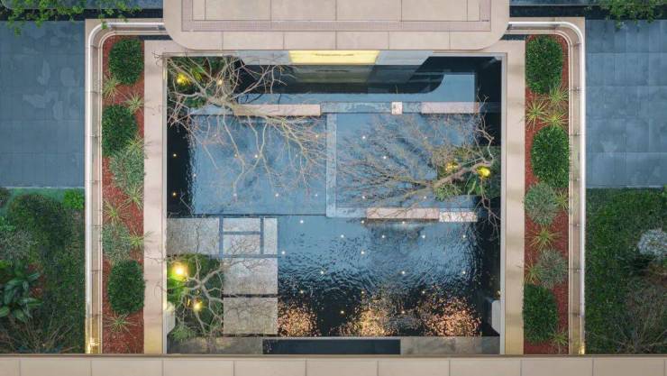 前坪中心的精致水景+艺术装置,风水寓意极好。
